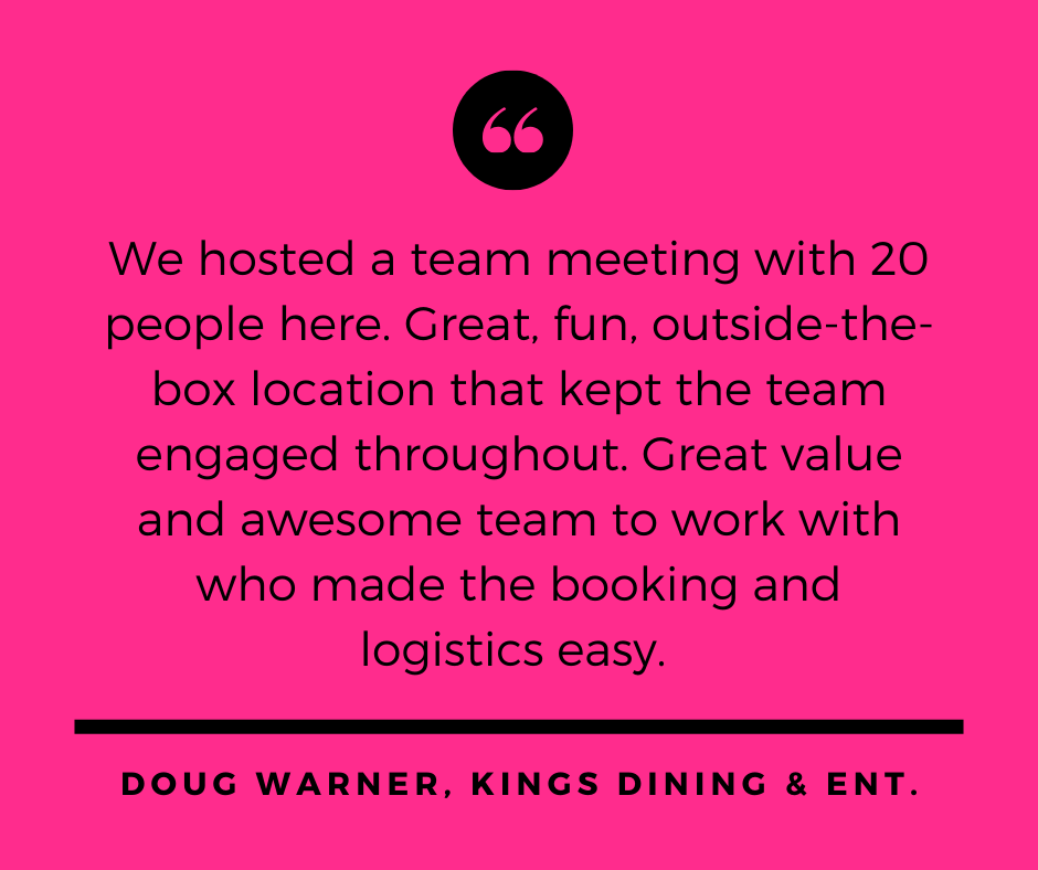 You may have asked yourself, what are some good team building exercises or how can I increase employee engagement in the workplace? Maybe you are looking for something other than the same old hotel meeting spaces for rent - we are your answer! Whether utilized for a traditional off-site, meeting space, presentation, brainstorming, team building, day retreat, etc. - our venues are the ideal environment for any group that's looking to mix things up and try something new!